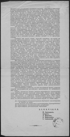 Texte signé par Pavel Borisovitch Axelrod, Isaac Sergueievitch Astrov, Julius Martov, Alexsandr Samoïlovitch Martynov, Semion Ioulevitch Semkovsky.