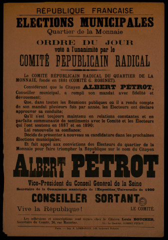 Élections municipales Quartier de la Monnaie : Ordre du jour voté à l'unanimité par le Comité républicain radical