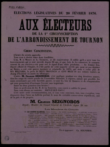 Aux électeurs de la 1re circonscription de l'arrondissement de Tournon : M. Charles Seignobos