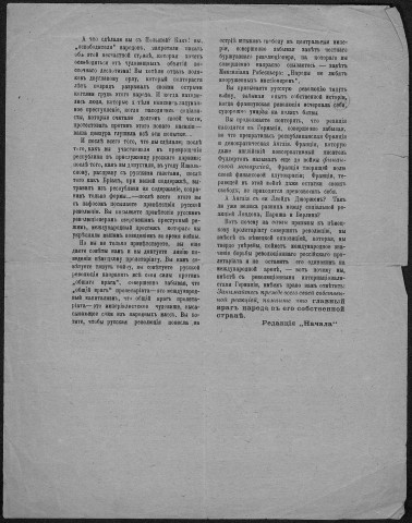 Ce fonds (chemise 2) contient aussi une traduction en français du texte, titrée : Réponse du quotidien internationaliste russe de Paris Natchalo au Groupe socialiste parlementaire.