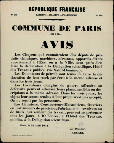 N°186. Les citoyens qui connaîtraient des dépôts de produits chimiques sont priés d'en faire la déclaration