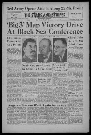 Une du journal disant que les "Big 3" (Staline, Churchill et Roosevelt) se rencontrent pour parler de la fin de la guerre